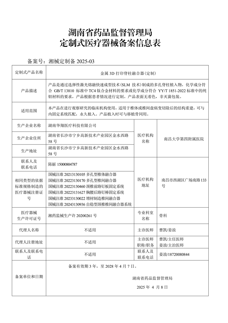 定制式医疗器械备案信息表(湘械定制备2025-03)