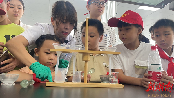 大众卫生报·新湖南客户端9月6日(记者 王璐 通讯员 陈得雨)“哇,清亮的维生素C溶液中加入一滴‘神秘’液体竟然变成黑色了!”“小白鼠住空调房、吃无菌食物,它们是勇敢的‘试药员’!”……湖南省药品检验检测研究院实验室里,传来孩子们一阵阵兴奋的惊呼,童言童语里充满对药理知识的好奇,从此一颗“安全用药”的种子在他们的小小心灵生根发芽。