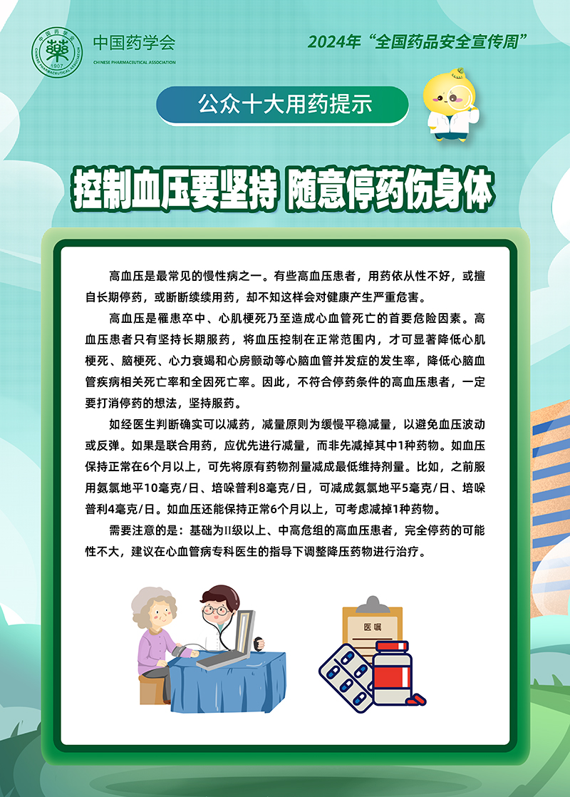 2024年“全国药品安全宣传周”公众十大用药提示丨2.控制血压要坚持,随意停药伤身体